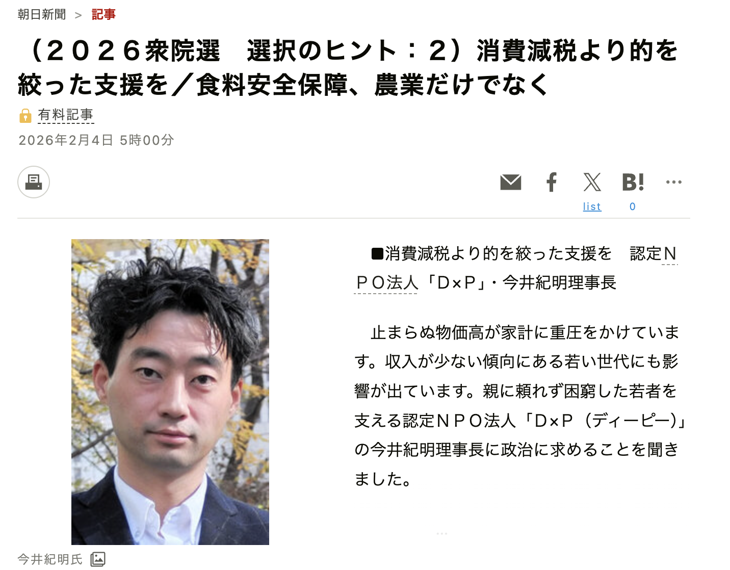 2026年2月4日(水)「朝日新聞」に、D×Pが政治に求めることを掲載いただきました。